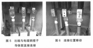 穿墻套管下部為出線,與電纜銅搭子導(dǎo)體部直接聯(lián)接,如圖5所示。撤消聯(lián)接螺栓后發(fā)生聯(lián)接方位移動(dòng),如圖6所示。此現(xiàn)象說(shuō)明電纜銅搭子與穿墻套管存在很大的聯(lián)接變形,并發(fā)生應(yīng)力,在電纜通電后發(fā)生的電動(dòng)力和聯(lián)接應(yīng)力進(jìn)一步作用于穿墻套管,使得穿墻套管發(fā)生碎裂。